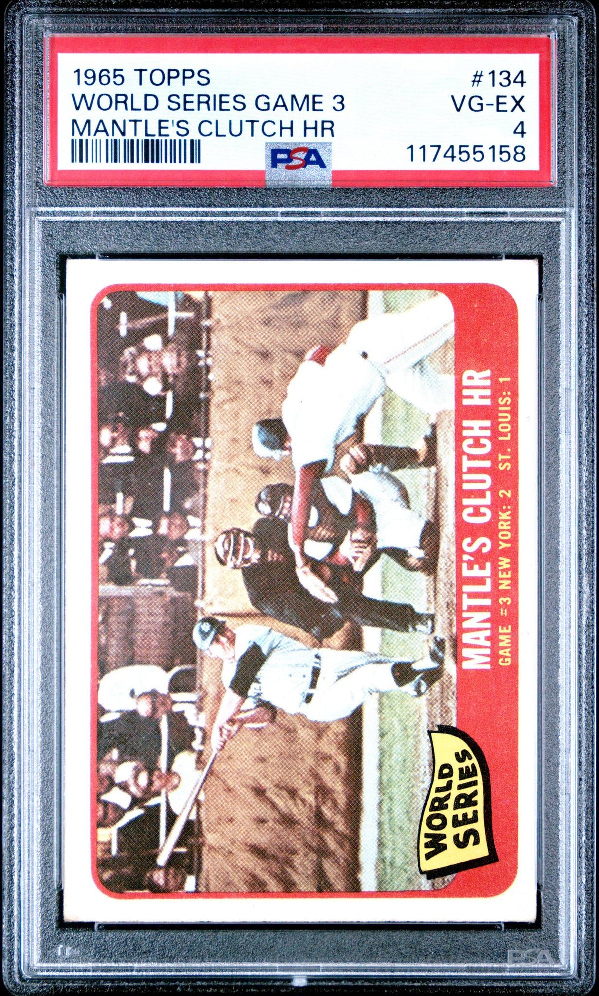 This is not a rookie card, but the "Mantle's Clutch HR" card from the World Series 1965 set, making it a prized addition to any collection. This card is a must-have for any baseball enthusiast, Yankees fan, or vintage card collector. The card's key features include the 1965 Topps baseball card, Mantle's Clutch HR, World Series Game 3, PSA graded, VG-EX condition, iconic sports moment, collectible vintage card, and MLB memorabilia.