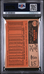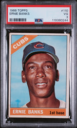 Immerse yourself in the nostalgic charm of baseball history with this magnificent 1966 Topps #110 card featuring the legendary Ernie Banks of the Chicago Cubs. A true gem for any collector, this card bridges the gap between the past and present, celebrating the life and career of one of Major League Baseball's most iconic figures. This card is a piece of time, manufactured by Topps, a brand synonymous with quality and tradition in the realm of baseball card collecting. The superb design and attention to detail reflect the standard that Topps has been known for since its inception. This card is not just a collectible, but a testament to the era it hails from. Graded '3' and labeled as 'VG' by the prestigious PSA, this card is preserved in a state that evokes the vintage charm of 1960s baseball. This professional grading assures you of the authenticity and condition of the card, making it a secure and worthwhile addition to your collection. What makes this 1966 Topps Ernie Banks card even more special is its rarity. The 1966 issue is a beloved set among collectors, known for its vibrant colors and classic design. This Ernie Banks card, with its appealing aesthetics and historical significance, is a key highlight of the set. As you hold this card, you hold a piece of Ernie Banks' legacy. Known for his power-hitting prowess and cheerful personality, Banks is a true icon of the game. His spirit is captured beautifully in this card, making it not just a collector's item, but a tribute to a player who has left an indelible mark on baseball. In summary, this card is not merely a collectible. It's a piece of history, a celebration of an iconic player, and a testament to the golden era of baseball. This 1966 Topps Ernie Banks card is a must-have for any serious collector or avid baseball enthusiast. It's an opportunity to own a piece of the past, a tangible link to the glory days of Major League Baseball. Secure your piece of history today with this stunning vintage collectible.