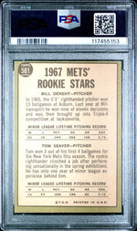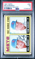 Immerse yourself in the classic era of baseball with this 1967 Topps Mets Rookies card featuring the dynamic duo of B. Deney and T. Seaver. This card, hailing from the esteemed Topps manufacturer, is a must-have for any sports card collector or Mets fan. The card has been professionally graded as PSA 3, a testament to its vintage allure and good condition. It is not just a card, but a piece of history, capturing the nascent stages of these rookies' illustrious careers. The card is not autographed, which keeps the focus on the original design and the players' information, enhancing its nostalgic charm. As a part of the iconic '1967 Topps Mets Rookies' set, this card is a significant memento of the Mets' history. It's a wonderful chance to own a snapshot of this exciting year in baseball history. This card is a genuine piece of sports memorabilia that lets you cherish the early days of these exceptional players. The card's key features include the year 1967, Topps as the brand, the Mets Rookies set, and the players Bill Denehy and Tom Seaver. This card is not just a piece of cardboard, but a ticket to the past, a tangible reminder of the timeless allure of America's favorite pastime. It's a remarkably unique collectible that perfectly encapsulates the heart and soul of baseball. Add this card to your collection and let the spirit of the game live on through this timeless memento.