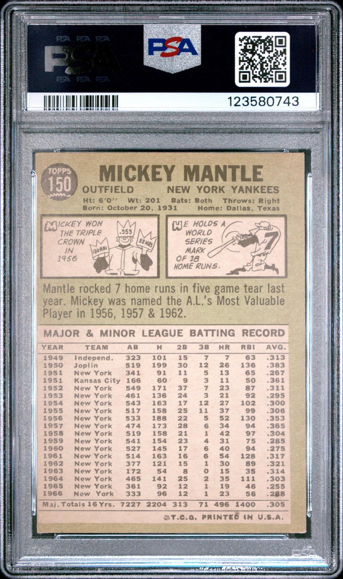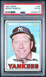 Immerse yourself in baseball history with this incredible 1967 Topps #150 Mickey Mantle card. This card celebrates one of baseball's most iconic figures, Mickey Mantle - a name that is synonymous with the New York Yankees and Major League Baseball. Hailing from the golden era of baseball, this card stands as a testament to Mantle's legendary career. Exemplifying the elegance of the 1967 Topps set, this card presents a stunning visual appeal that any collector would be proud to own. The card has been professionally graded by PSA, the industry's leading card grading company, and has been awarded a VG-EX (Very Good - Excellent) condition grade of 4. This grade is an assurance of the card's authenticity and its preservation over half a century. Adding to its allure, this card is part of the esteemed Topps brand, known for their high-quality and exclusive baseball cards. The card itself is not merely a piece of cardboard, but a tangible piece of baseball history, representing Mantle's magical reign in the MLB. This card does not contain any autographs or memorabilia, preserving the original, untouched beauty of the card. The focus is solely on Mantle, his team - the Yankees, and the 1967 season, making it a truly vintage collectible. Whether you're a seasoned collector, a die-hard Yankees fan, or a baseball enthusiast, this 1967 Topps Mickey Mantle card is a must-have! It's not just a card; it's a piece of time, a reflection of a bygone era, and a tribute to one of the greatest players of the game. This is your chance to own a piece of baseball history. Don't miss out on this classic Mickey Mantle card!
