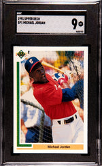 Step into the world of sports memorabilia with this exceptional 1991 Upper Deck SP1 Michael Jordan Baseball Card. A must-have for any serious sports card collector, this unique piece hails from the renowned manufacturer Upper Deck. This particular card is not just any card, it showcases the multi-talented Michael Jordan during his stint with the MLB's Chicago White Sox, adding a unique twist to your collection. Expertly graded by the prestigious SGC, this card carries a high numeric grade of 9, indicating its Mint condition. This level of grading ensures that the card has maintained its impeccable state, boasting sharp corners, bright colors and a flawless surface. A testament to its quality and care over the past three decades. This card is part of the coveted 1991 Upper Deck Baseball Card Set, a well-regarded collection in the world of sports card collecting. The card's key features include its Upper Deck branding, its year of issue, and the fact that it represents Michael Jordan's venture into the world of baseball. This card does not come with an autograph or memorabilia, making it a pure and authentic representation of the period and the player's career. It's a tangible piece of sports history, perfect for any fan of Michael Jordan, the White Sox, or Major League Baseball. In conclusion, this 1991 Upper Deck SP1 Michael Jordan Baseball Card is a remarkable piece of sports history, offering a unique perspective on one of basketball's greatest players. With its pristine condition and high-grade rating, this card would be a splendid addition to any sports card collection. Don't miss the opportunity to own this phenomenal piece.