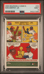 Experience the joy of owning a piece of sports history with this exceptional 2003 Bazooka Comics Ken Griffey Jr. card. Card #23 in the series, this gem has been meticulously preserved and has been graded a PSA 9, signifying its near-mint condition.