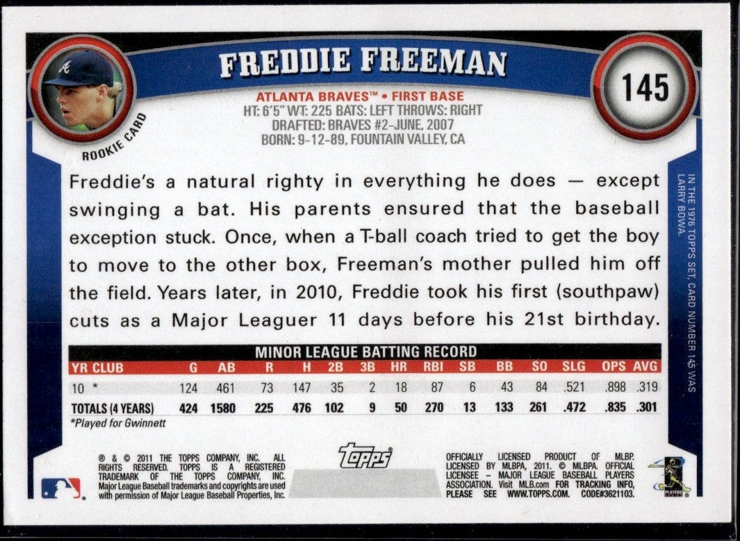 Add a piece of baseball history to your collection with this 2011 Topps 145 Freddie Freeman Rookie Atlanta Braves card. Its historical significance and aesthetic appeal make it a prime choice for collectors and sports enthusiasts alike. Don't miss out on the chance to own a piece of Freddie Freeman's rookie legacy!