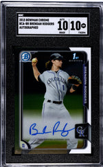 The card comes from the 2015 Bowman Chrome set, a popular set known for its stunning designs and exceptional quality. This card stands out in this set with its autograph and perfect grading.
