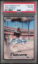 Step up your sports card collection with this exceptional 2017 Topps Stadium Club Autograph card featuring the legendary MLB player, Jose Canseco. This premium card, produced by well-regarded manufacturer Topps, is part of the sought-after Stadium Club set, known for its high-quality production and distinct design.