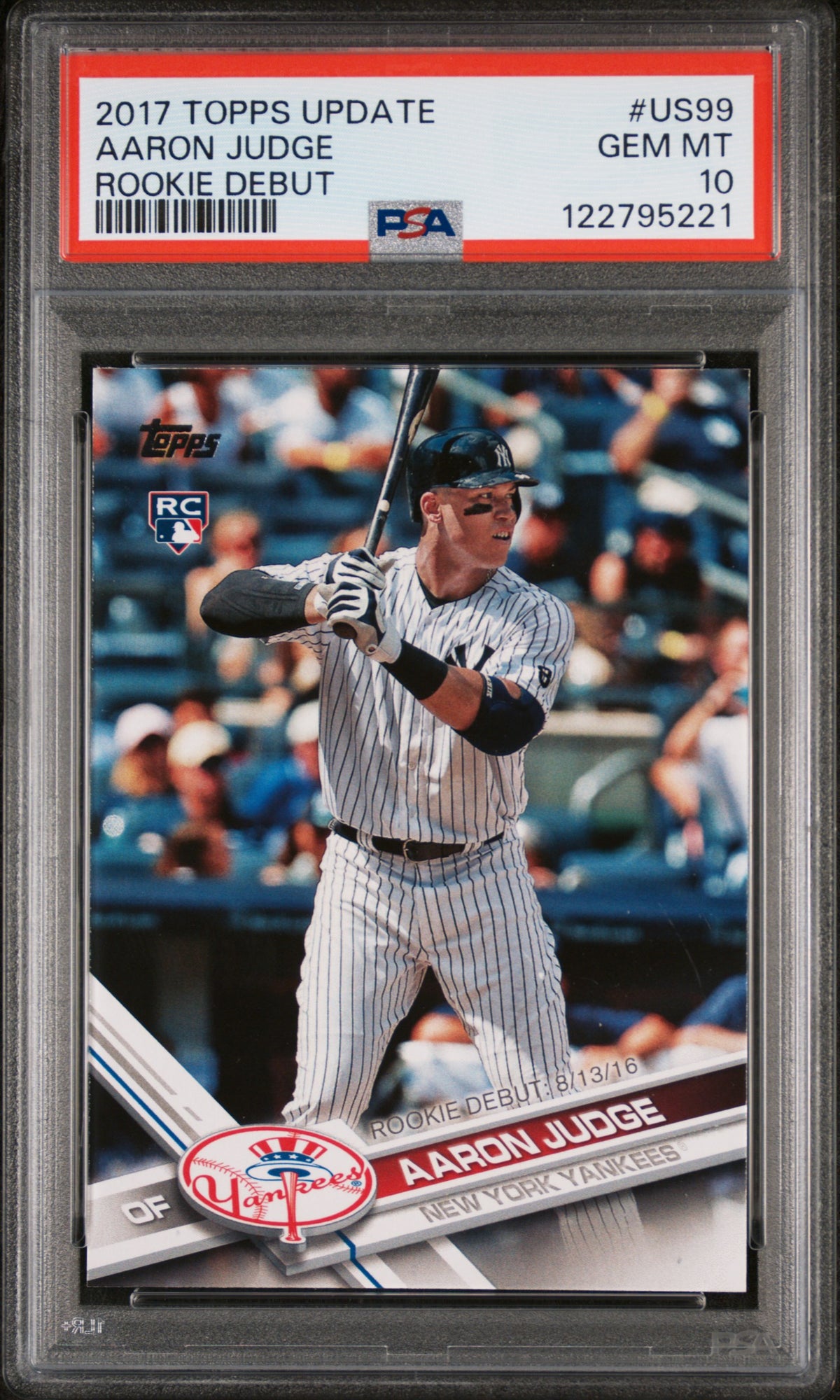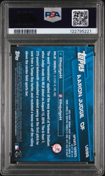 Step into the big leagues with this stunning 2017 Topps Update US99 Aaron Judge Rookie Debut card! This highly sought-after collectable features one of the most exciting players in the MLB: Aaron Judge of the New York Yankees. A shining example of Topps' superior craftsmanship, this card has been professionally graded by the prestigious PSA and has achieved the Gem Mint 10 grade, the highest accolade for any sports card. It's a testament to the impeccable condition of this card, a truly rare find that will make a valuable addition to any collection.