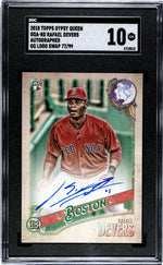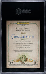 Step into the world of baseball with this extraordinary 2018 Topps Gypsy Queen Rafael Devers rookie card! This gem features the talented third baseman of the prestigious Boston Red Sox, a shining star in the MLB universe. Autographed by Devers himself, this card holds a personal touch that is sure to captivate any baseball enthusiast.