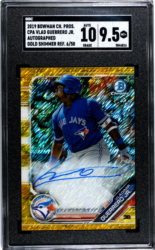 Feast your eyes on the stunning '2019 Bowman Chrome Draft #CPA-VGJ Vladimir Guerrero Jr. Auto. Gold Shimmer Refractor 6 SGC 9.5'! A true gem for any serious collector, this card boasts an exclusive Gold Shimmer Refractor design that is as rare as it is beautiful. With a grade of SGC 9.5, it is in excellent condition and is a testament to the quality and care Bowman Chrome puts into each of their cards.