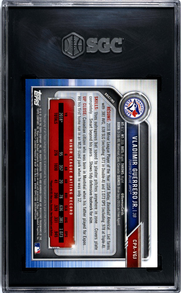 The card features Vladimir Guerrero Jr., a rising star in the baseball world whose career is already drawing comparisons to some of the greats. The autograph on the card is crisp and clear, adding a personal touch from Guerrero Jr. himself.