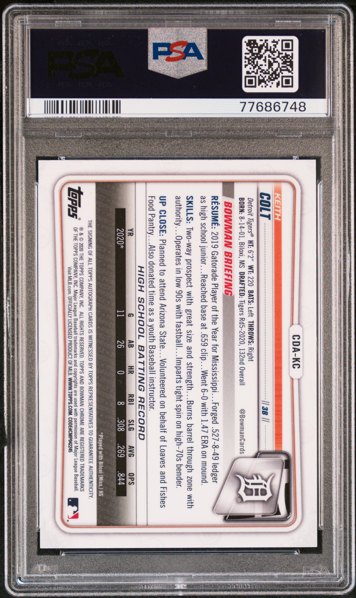 Introducing the absolute gem of sports card collections - the illustrious 2020 Bowman Chrome Draft Autographs Sparkle Refractor Keith Colt /71 PSA 10. This extraordinary card, numbered 'CDAKC', is a dazzling example of the exceptional quality that Bowman Chrome Draft is renowned for.