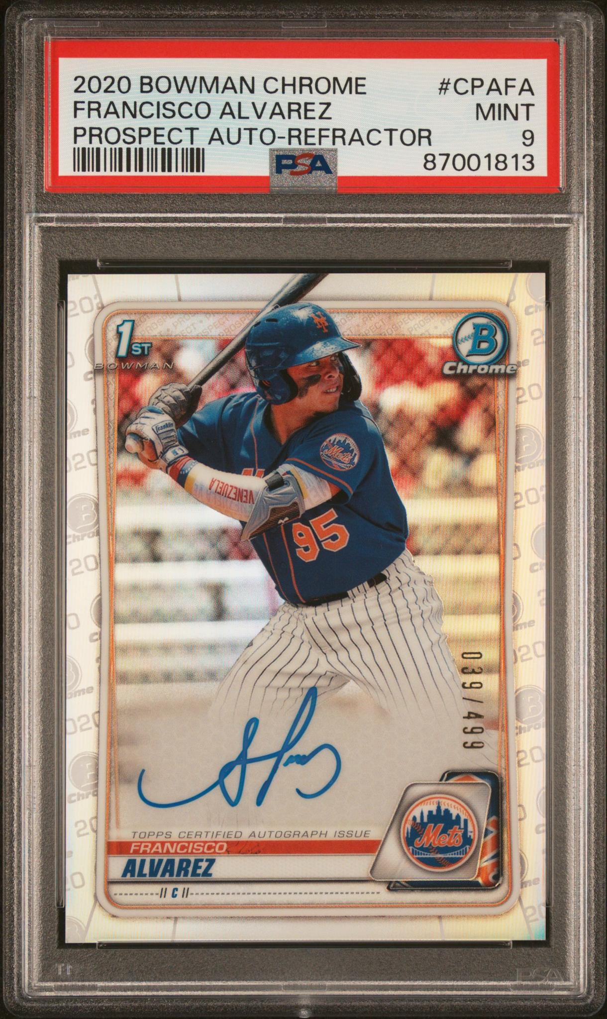 Presenting the phenomenal 2020 Bowman Chrome #CPA-FA Francisco Alvarez rookie card! This marvel is issued by the reputable Topps under the 'Bowman Chrome' brand. What makes it truly special is the 'Prospect Auto-Refractor' insert set, adding a unique charm to your collection. A true gem for New York Mets fans, this card carries the autograph of the promising player Francisco Alvarez, adding an authentic personal touch that every collector craves. The card is a rare find with a serial number of 039/499, making it a limited-edition piece for your collection. Graded as MINT '9' by the leading grading company PSA, this card assures you of its top-notch quality and excellent condition. The refractor parallel adds a mesmerizing sheen to the card, making it a true spectacle to behold. This card doesn't just represent a player; it's a piece of baseball history, an embodiment of the game you love. The fact that it's a rookie card amplifies its value, capturing Francisco Alvarez at the exciting onset of his MLB career. If you're a collector with a discerning eye for baseball memorabilia, this card is a must-have. Its key features - from the Prospect Auto-Refractor to the mint condition, from the PSA grading to the autograph, from its status as a rookie card to its limited edition - all combine to make this piece a treasure trove of baseball magic. In short, this Francisco Alvarez card is not merely a collectible, but a testament to the thrilling world of baseball. Add this to your collection and let the legacy of the New York Mets and the promising talent of Francisco Alvarez shine through your showcase.