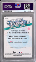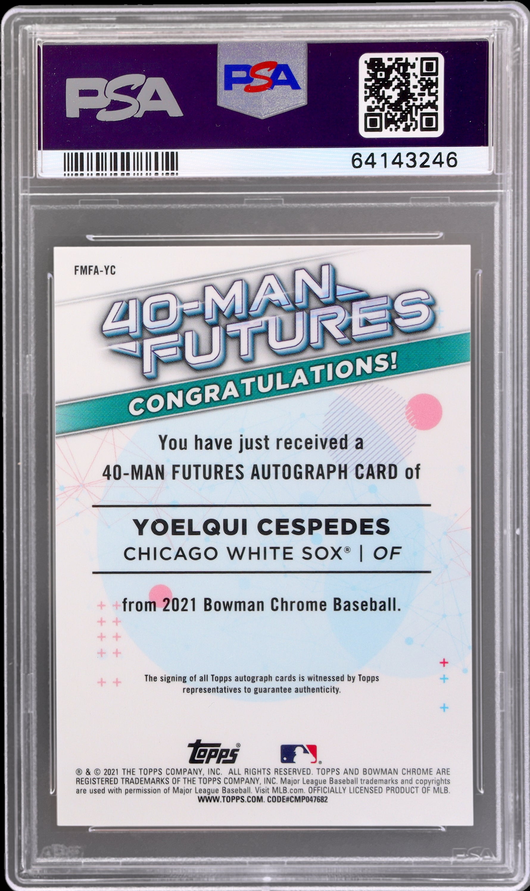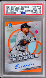 In summary, this 2021 Bowman Chrome 40-Man Futures Auto Orange Yoelqui Cespedes /25 PSA 10 card is a perfect blend of rarity, quality, and sports heritage. Whether you're a seasoned collector, a passionate sports fan, or someone who appreciates the value of rare finds, this card is a valuable and exciting acquisition.