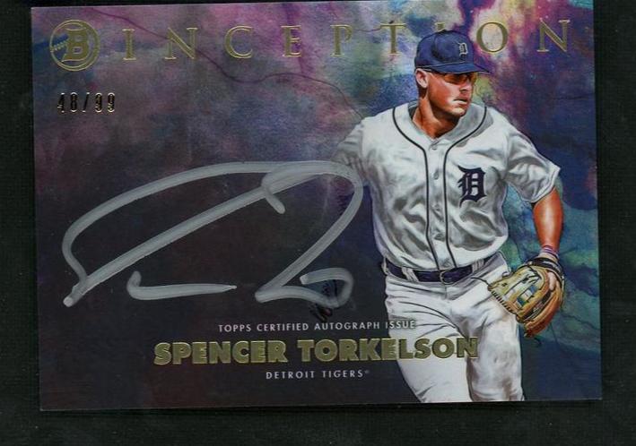 Discover the ultimate gem of sports memorabilia with this impressive 2021 Topps Inception Spencer Torkelson baseball card! This exceptional piece is from the highly sought-after Bowman Silver Signings insert set, making it a must-have addition to any serious collection. But the appeal does not stop there. This card is autographed by the Detroit Tigers' own Spencer Torkelson, a rising star in the MLB. The autograph adds an extra layer of authenticity and personal connection to the player, making this card all the more special. A unique feature of this card is its serial number. Limited to only 100 pieces, this card is number 41, making it a rare and valuable collectible. The scarcity of this card enhances its value and appeal, offering the exciting opportunity to own a piece of baseball history. This card, part of the exclusive Bowman Inception Baseball set, is not a rookie card but it still exudes a sense of history and prestige. It's important to note that the card is not professionally graded. However, the card's condition does not detract from its overall appeal and collectability. Emphasizing key features such as the autograph, limited edition status, serial numbering, and the connection to MLB and Spencer Torkelson of the Detroit Tigers, this card truly stands out. It is an embodiment of baseball history and the promising career of Torkelson, making it a perfect gift for die-hard fans or a splendid addition to your own collection. Don't miss the chance to own this extraordinary piece of sports memorabilia. This 2021 Inception Spencer Torkelson baseball card is more than just a card - it's a snapshot of a rising star's journey in the world of MLB. Add this to your collection and watch as it becomes the envy of your fellow collectors!