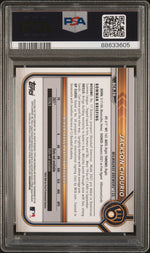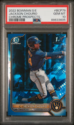The card's key features include its Gem Mint 10 condition, PSA grading, Jackson Chourio as the featured player, and its affiliation with the Milwaukee Brewers team. As part of the Chrome Prospects set of the Topps licensed 2022 Bowman series, this card stands out in terms of its collectible value and investment potential.