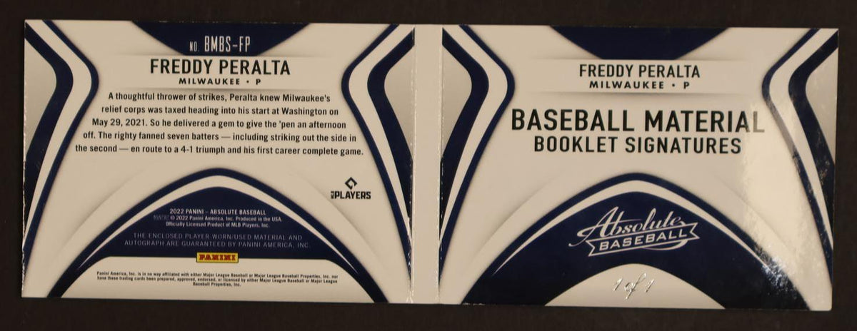The card is part of the sought-after 'Baseball Material Booklet Signatures' insert set, a hallmark of the Absolute brand, admired by collectors for its quality and design. What sets this card apart is the autograph, personally signed by Freddy Peralta, solidifying its authenticity and giving it a personal touch.