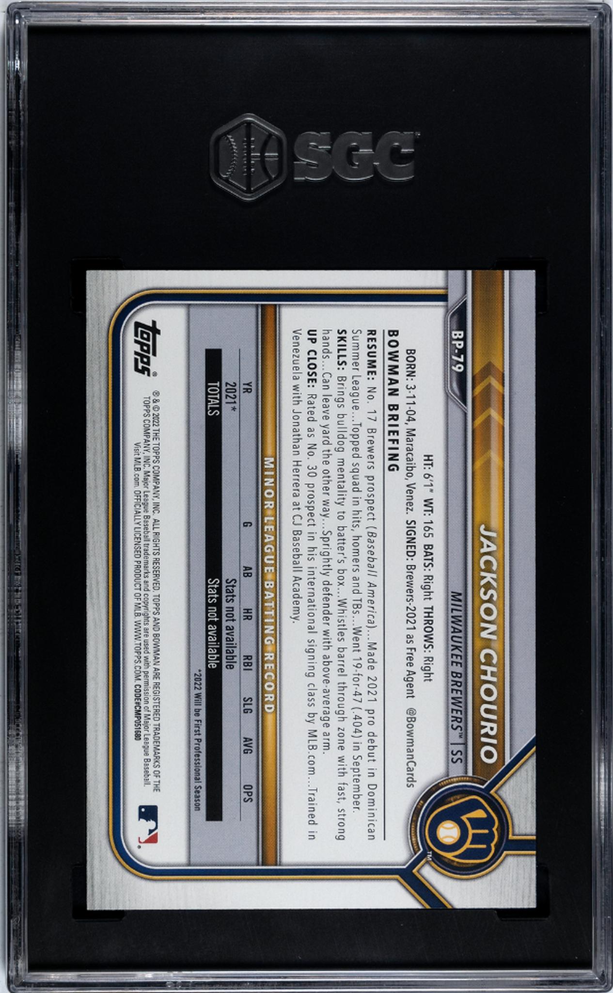 Delve into the exciting world of sports card collecting with this exceptional 2022 Bowman Prospects Card, BP-79, featuring the rising star, Jackson Chourio. Produced by the renowned manufacturer, Topps, this card captures Chourio's rookie year with the Milwaukee Brewers, making it an absolute gem for collectors and Brewers fans alike.