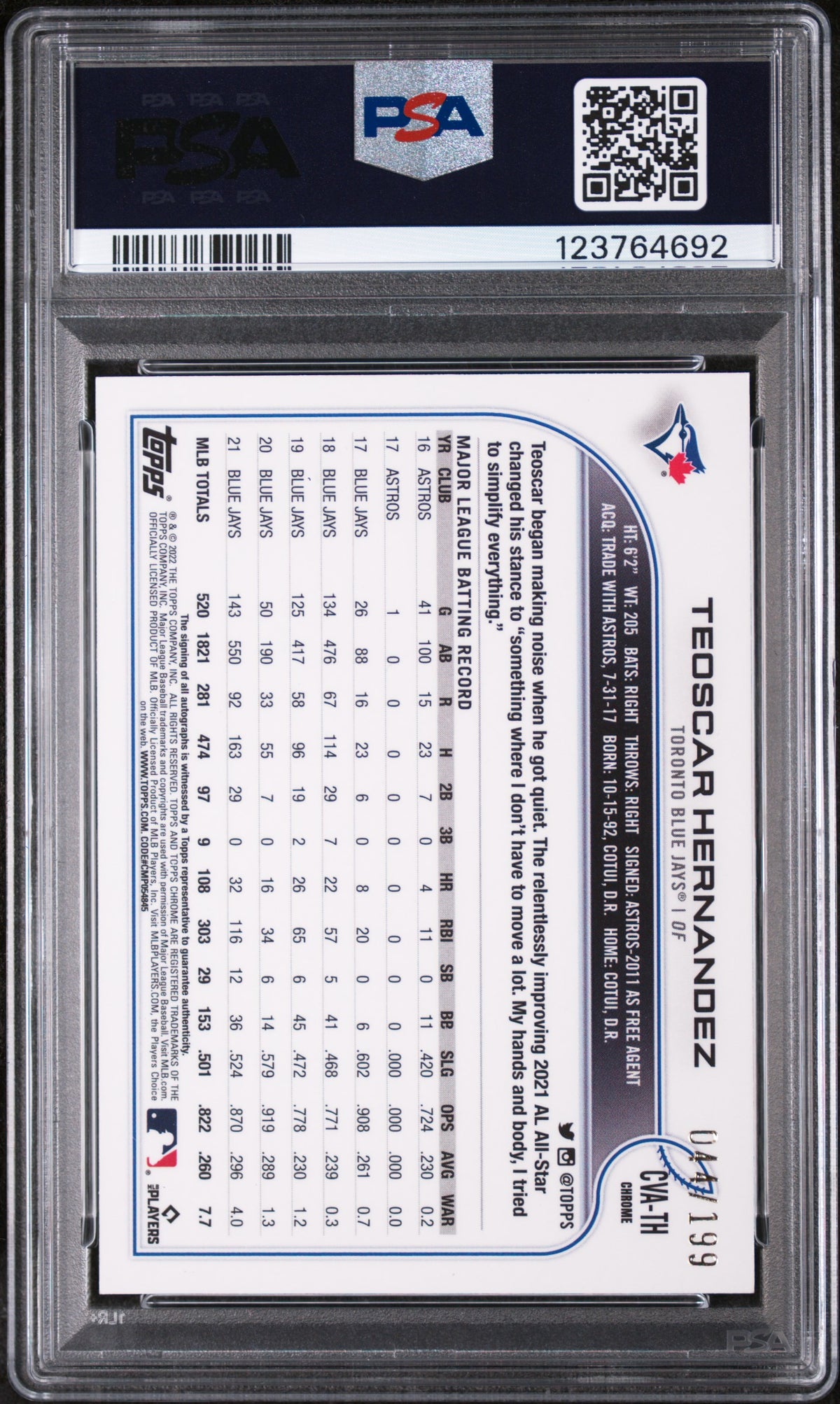 With this card, you're not just getting any ordinary one, but an autographed piece by Teoscar Hernandez himself, a prominent player in the Toronto Blue Jays team. It's a tangible piece of MLB history that any fan would be proud to own.