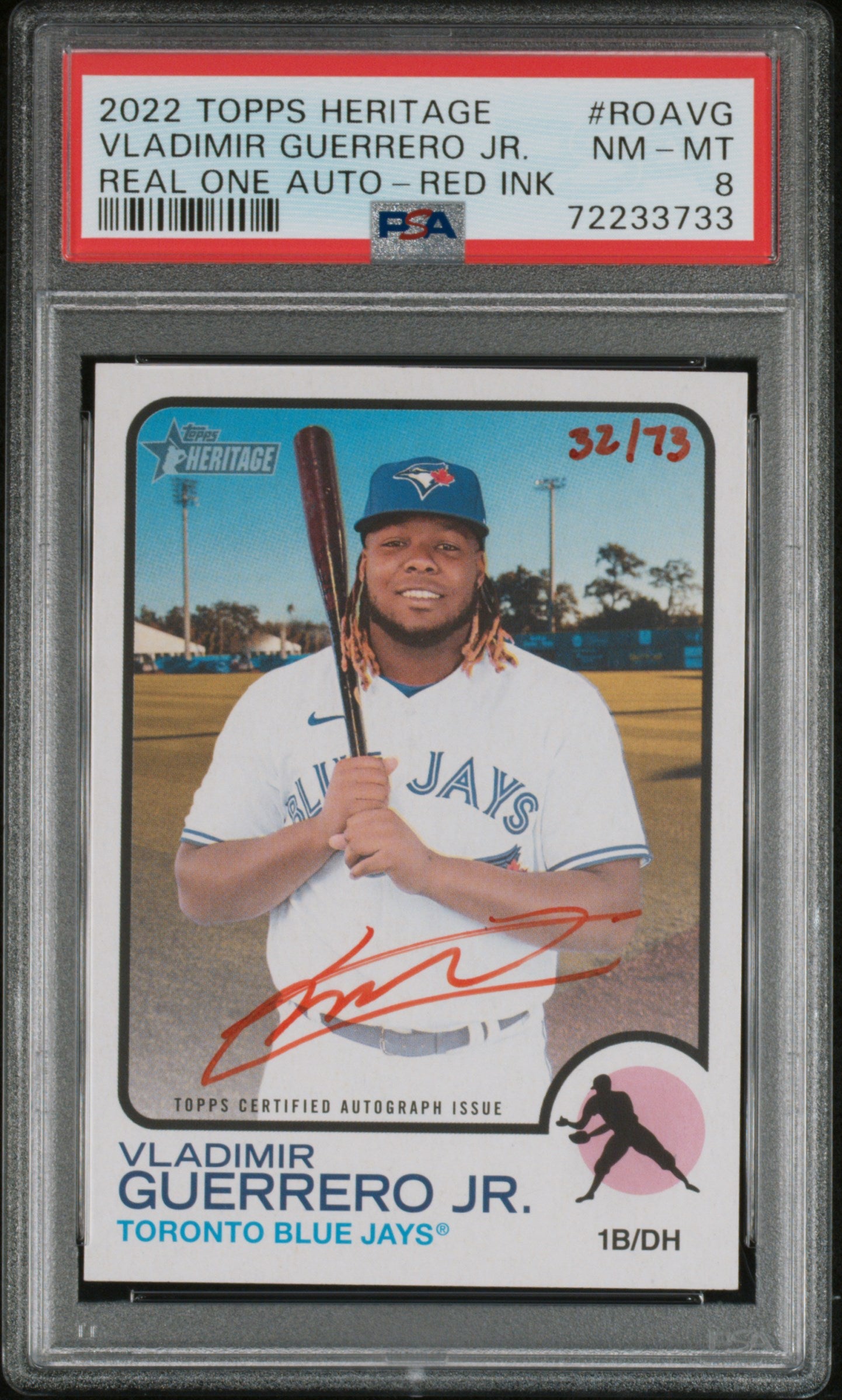 Step right up, baseball enthusiasts and avid collectors! Feast your eyes on this exquisite piece of baseball history - the 2022 Topps Heritage 'Real One Auto - Red Ink' card featuring the phenomenal Vladimir Guerrero Jr. of the Toronto Blue Jays. This is not just any card; it's an autographed gem, personally signed by Guerrero Jr. himself, adding a personal touch that's second to none.