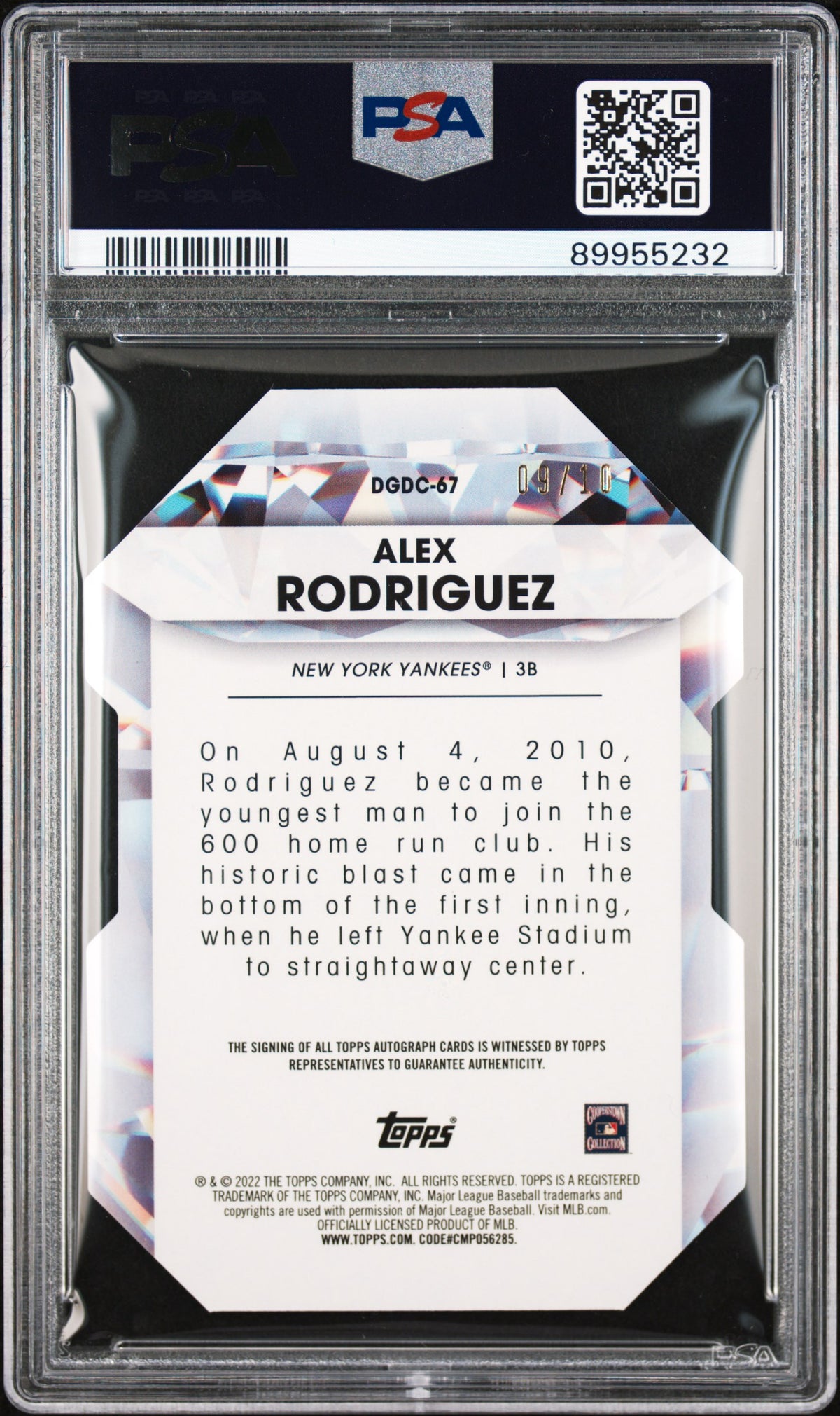 Dive into the baseball magic with this extraordinary 2022 Topps Diamond Greats Alex Rodriguez card. Celebrate the legacy of one of the most dynamic players in the MLB, 'A-Rod', who played for the illustrious New York Yankees. This card isn't just a piece of paper; it's a piece of history. This unique item is autographed by Alex Rodriguez himself, adding an unparalleled personal touch. The autograph isn't just a signature; it's the mark of a sports legend, making this card a must-have for any serious collector. Crafted by the renowned manufacturer Topps, this card belongs to the Diamond Greats set, symbolizing the pinnacle of baseball card collecting. The card number 'DGDC-67' is a testament to its authenticity and uniqueness, with only ten of these ever made, this card carries a serial number of '09/10', emphasizing its rarity and exclusivity. The card's quality is unquestionable, as it has been professionally graded by PSA, the industry leader in sports memorabilia grading. With a staggering grade of 9, this card falls into the 'Mint' category, an indication of its superior condition and quality. The Diamond Greats Autographs set is known for its selective inclusion of only the most eminent players. Being a part of this set, this card represents the grandeur and the high-level performance that Alex Rodriguez consistently delivered on the field. The key features of this card include Alex Rodriguez's autograph, its limited edition status, its 'Mint 9' grade from PSA, its place in the 2022 Topps series, and its association with the New York Yankees. This card is not just a collectible; it's an investment. It's a token of appreciation for the wonderful sport that is baseball, a symbol of a fan's devotion, and a tangible memento of one of the greatest players to grace the diamond. Add this gem to your collection and own a piece of baseball history.