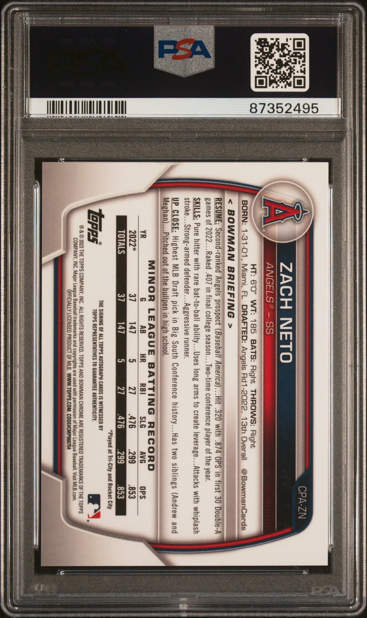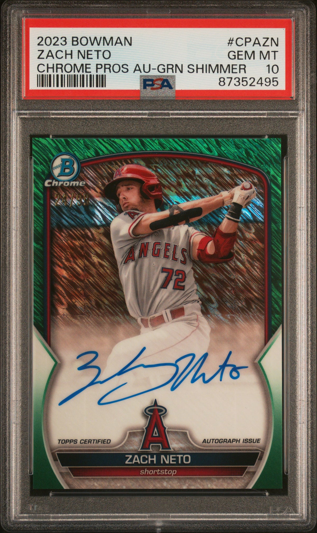 In summary, this 2023 Bowman Chrome Prospect Autographs Green Shimmer Zach Neto /99 PSA 10 card is a perfect blend of rarity, prestige, and beauty that will not only enhance your collection but also serve as a fantastic investment for the future. Don't miss the chance to own this extraordinary piece of sports memorabilia.
