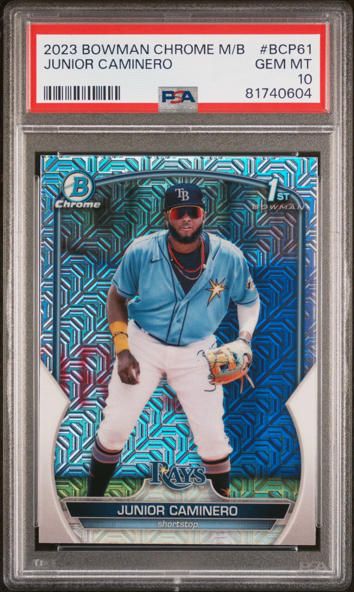 In the vast realm of baseball cards, this 2023 Bowman Chrome Junior Caminero rookie card stands out as a radiant gem. Its blend of aesthetic appeal, high-grade condition, and the potential future value make it an irresistible choice for collectors and enthusiasts alike. This card is not just a piece of sports memorabilia; it's a part of baseball history, a tribute to the promising talent of Junior Caminero, and a worthy addition to any collection.