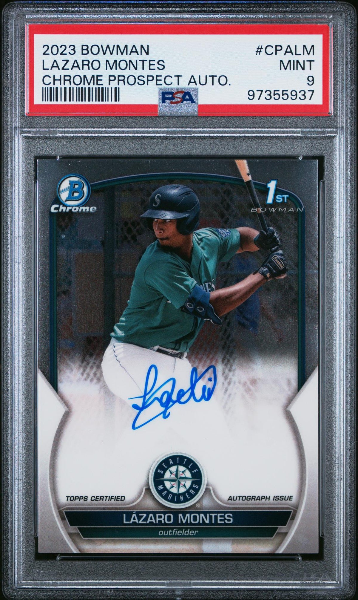 Feast your eyes on this one-of-a-kind gem from the world of professional baseball - an autographed Lazaro Montes card from the Bowman 2023 Chrome Prospect Auto Set. Manufactured by industry giants Topps, this card is an absolute must-have for any serious collector or fan of the Seattle Mariners. The card is a testament to Lazaro Montes' prominence in baseball, and his autograph makes it an extraordinarily special collectible. The authenticity and quality of the card are indisputable, as it has been professionally graded as 'Mint' by the renowned grading company, PSA. With a stunning numeric grade of '9', this card is not just a piece of baseball history, but also a symbol of quality and prestige. The card's unique identifier - 'CPALM', and the year of issue - 2023, further enhance its distinctiveness. Despite not being a rookie card, its appeal is undeniably high, making it a glorious addition to any collection. One of the key highlights of this card is the Chrome Prospect Auto Set it belongs to. This set is known for its high-quality production and superior design, and this card is no exception. The glossy finish and sharp details make it a visually captivating piece. This Lazaro Montes card does not come with any attached memorabilia. However, its autographed status, high grade, and affiliation with the Seattle Mariners make it an extraordinary piece on its own. In summary, this is more than just a sports card - it's a treasure for any collector or baseball enthusiast. Its superb condition, autographed status, and association with a star player like Lazaro Montes make it an irresistible acquisition. Don't miss the chance to own this piece of baseball history!