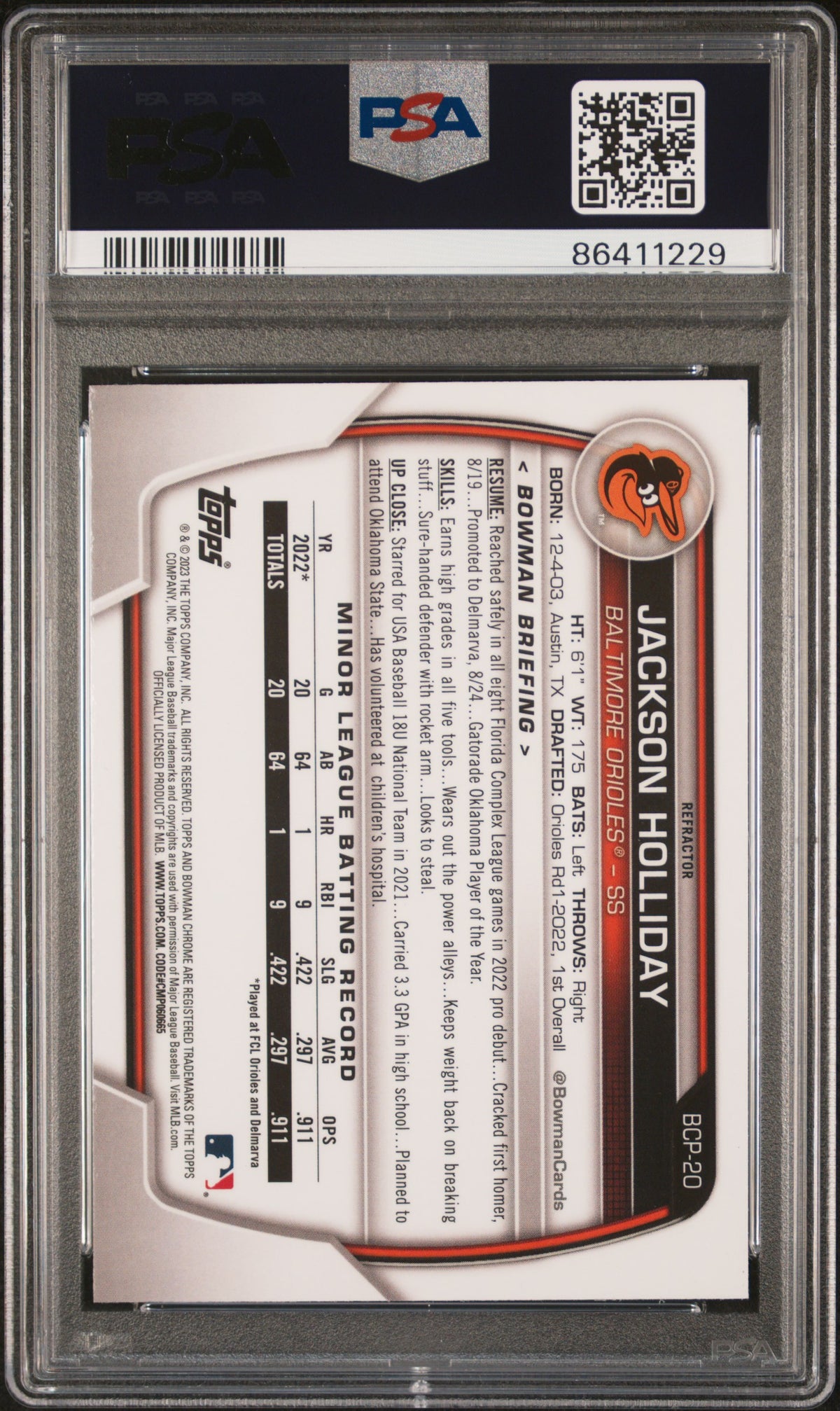 In conclusion, this 2023 Bowman BCP20 Jackson Holliday Lunar Glow PSA 10 card is a beautiful piece of sports history, a wonderful addition to any baseball card collection, and a fitting tribute to Jackson Holliday's talent and contribution to the sport. Don't miss your chance to own this magnificent piece!