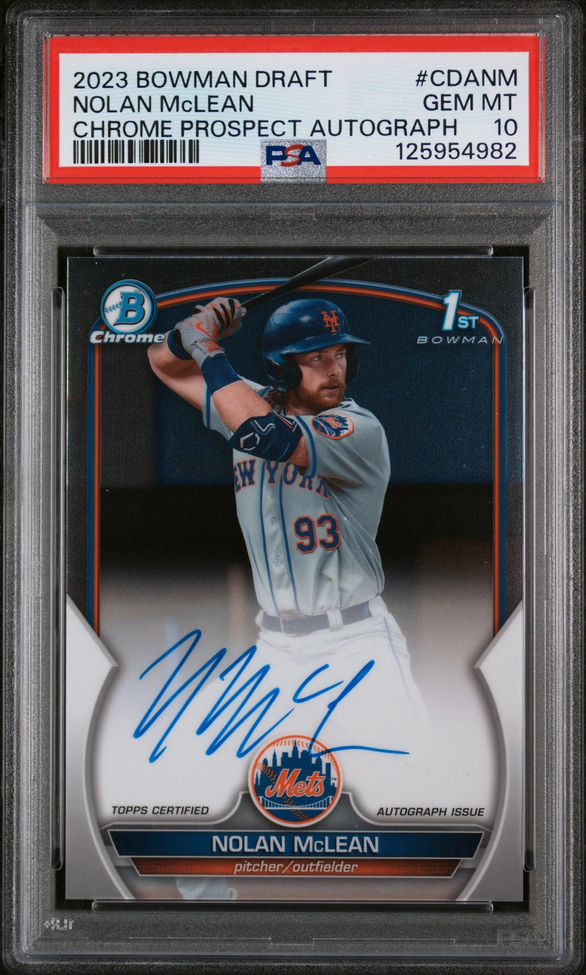 Step up your card collection game with this striking 2023 Bowman CDANM Nolan McLean sports card. Fresh from the Bowman Draft series, this card features the New York Mets' rising star, Nolan McLean, a name that's quickly becoming synonymous with power and precision in the baseball world. The card is autographed by McLean himself, giving it a personalized touch and an edge over other cards. What's more, this is a Rookie card, marking the player's professional debut, making it a must-have for any avid baseball card collector. Adding to its appeal is the PSA Gem Mint 10 grading, an assurance of the card's impeccable condition. This grading, done by the renowned Professional Sports Authenticator (PSA), is a testament to the card's pristine condition and high quality, making it a valuable addition to your collection. The card, manufactured by Topps, a trusted name in the sports card industry, features a Chrome Prospect Autograph insert set, further enhancing its visual appeal and collectability. Though it's not serial numbered or a parallel card, it stands out for its autograph and top-notch grading. This is an unmissable opportunity to own a piece of baseball history with this Nolan McLean Rookie card. Don't miss out on the chance to add this gem to your collection!