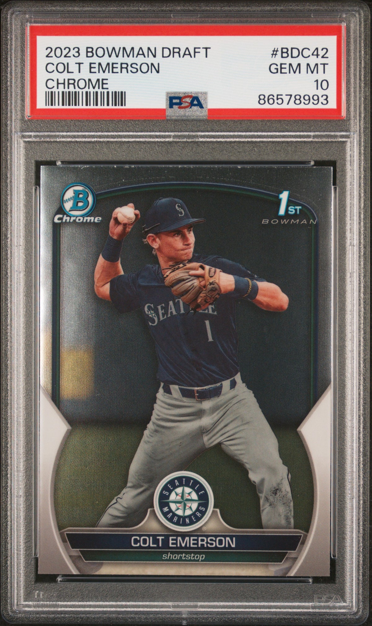The 2023 Bowman Chrome BDC-42 Colt Emerson PSA 10 card is a testament to Emerson's talent and a symbol of the vibrant future that lies ahead for this young athlete. Whether you're a Colt Emerson fan, a Seattle Mariners enthusiast, or a sports card collector, this card is a must-have addition to your collection.