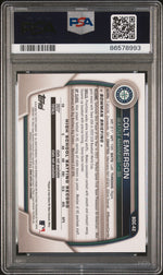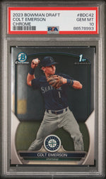 Presenting a sports card collector's dream - the 2023 Bowman Chrome BDC-42 Colt Emerson PSA 10. This rookie card is an absolute gem and a stellar addition to any sports card collection. Issued by the renowned Topps brand under their Bowman Draft Chrome set, this card boasts a gleaming chrome finish that adds a luxurious touch to its overall appeal.