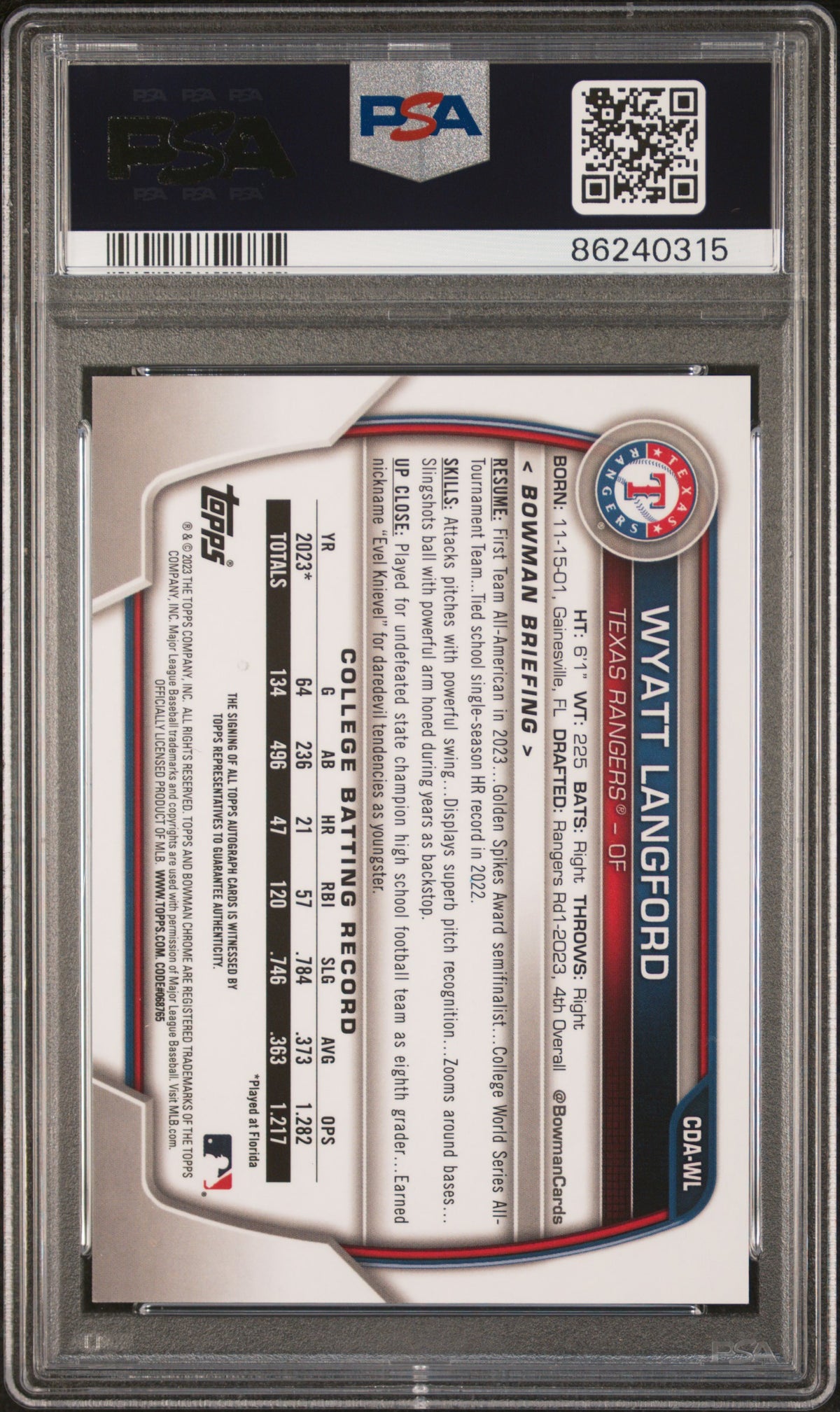 This card is a veritable gem for collectors and baseball fans alike. Its unique features, coupled with its excellent condition, make it an irresistible addition to any collection. Don't miss out on the chance to own a piece of baseball history with this 2023 Bowman CDA-WL Wyatt Langford card.