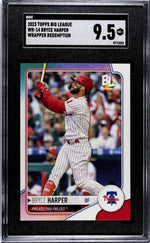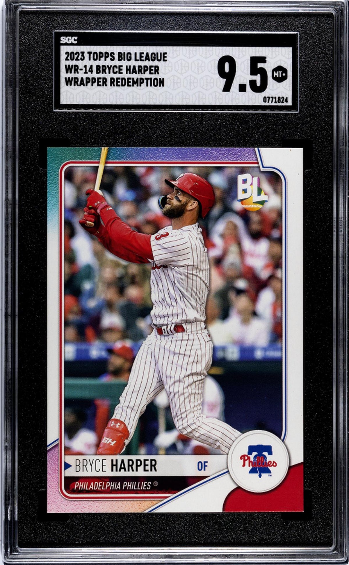 Every aspect of this card, from its '2023 Big League WR-14 Harper SGC 9.5' name to its inclusion in the 'Topps Big League Wrapper Redemption' set, screams exclusivity and sophistication. This is not just a card, it's a slice of baseball history, a token from Harper's journey, making it a must-have for any Phillies fan or baseball card collector.