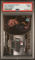 Key features include Paul Skenes as the player, Bowman Draft as the brand, Draft Night as the name of the insert set, Pittsburgh Pirates as the player's team, and an impressive PSA Mint 9 grading.