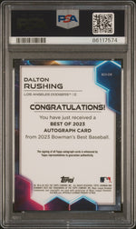 Feast your eyes on this exceptionally rare and desirable sports card - a 2023 Bowman's Best B23DR Dalton Rushing card. Manufactured by the renowned Topps, this card hails from the coveted 'Best of 2023 Auto-Gold' set and features the dynamic player Dalton Rushing, a proud member of the Los Angeles Dodgers.
