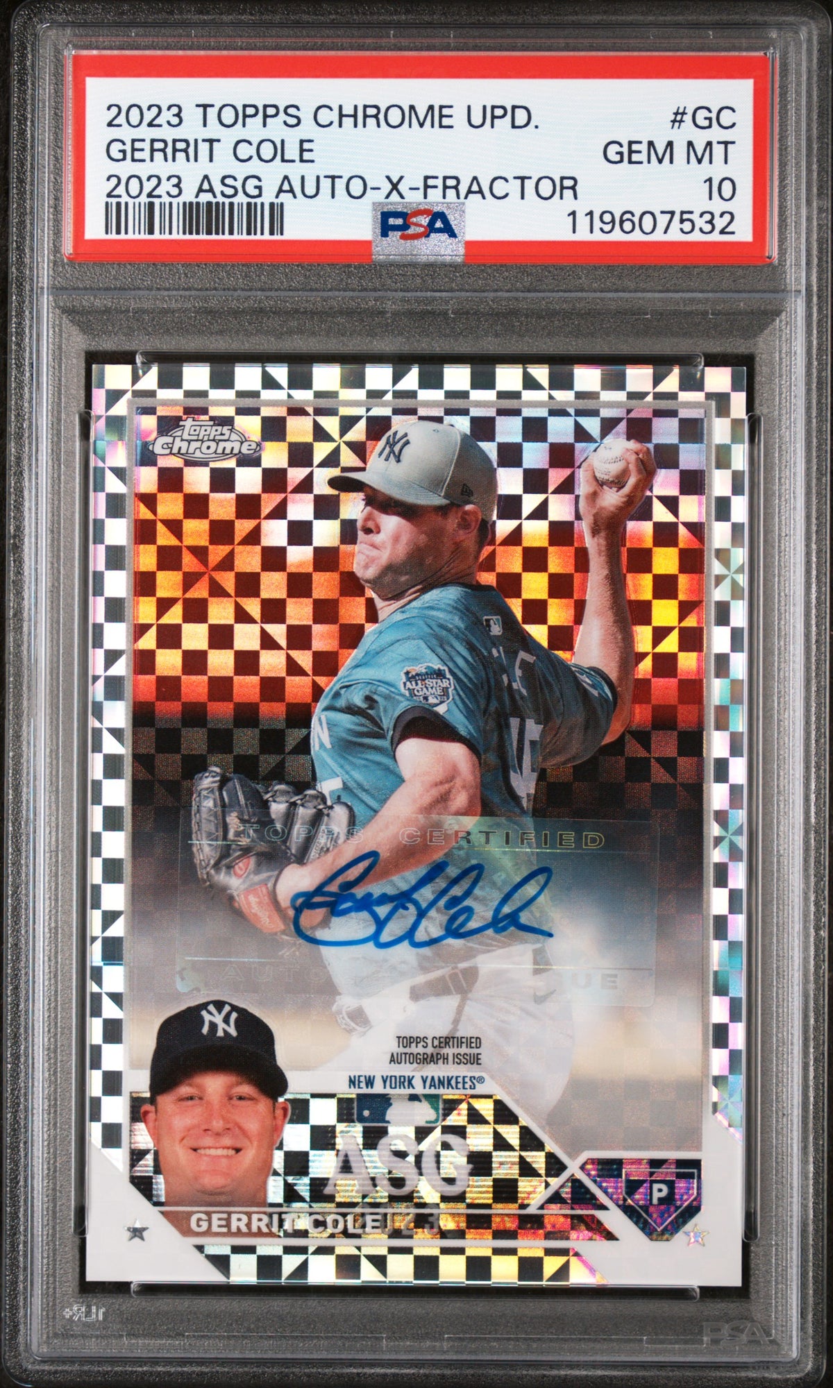 This card, part of the 2023 Topps Chrome ASG Auto-X-Fractor set, is truly a gem for collectors. Its key features include a Gerrit Cole autograph, X-Fractor parallel, and a serial number of 74/125. This PSA graded GEM MT 10 card is a must-have for fans of the MLB, Topps Chrome collectors, and especially for supporters of the New York Yankees.