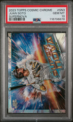 Key features of this card include its 2023 edition, the Topps Cosmic Chrome brand, being part of the Supernova insert set, its Gem Mint condition, and of course, it features one of MLB's shining stars, Juan Soto.