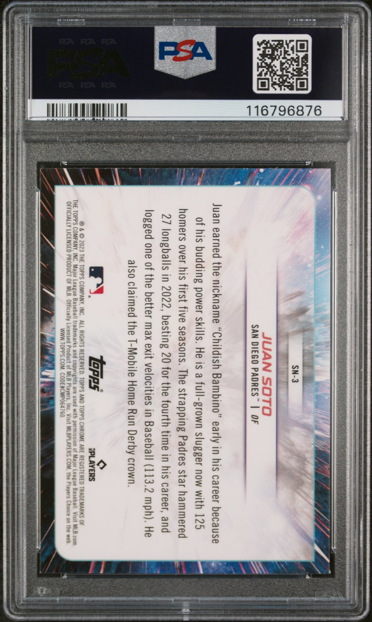 This card does not only celebrate Juan Soto's contribution to Major League Baseball, but it's also a testament to the beauty of collecting, encapsulating moments of sporting brilliance in a tangible format. Whether you're a die-hard Padres fan, an avid Juan Soto admirer, or a dedicated card collector, this 2023 Cosmic Chrome SN3 Juan Soto PSA 10 card is a must-have addition to your collection.