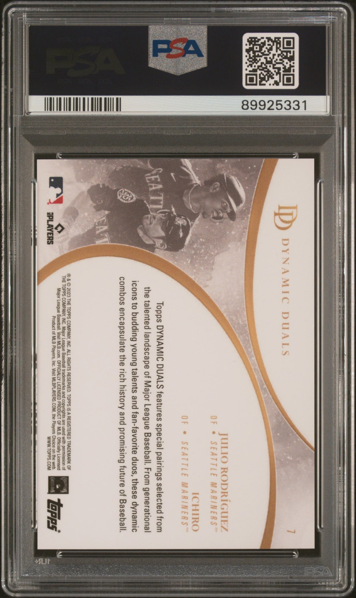 In summary, this 2023 Topps #7 Rodriguez/Ichiro card from the Dynamic Duals set is more than just a sports card. It's a tribute to two of the greatest players to ever grace the Seattle Mariners, presented in a superbly preserved condition. Don't miss this opportunity to add this exceptional piece to your collection.