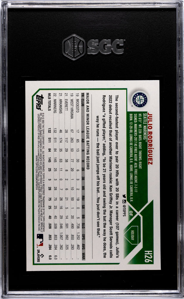 Step into the batter's box and prepare to be dazzled by this stunning 2023 Topps Holiday H26 card featuring the dynamic slugger, Julio Rodriguez of the Seattle Mariners. Manufactured by the industry-leading Topps, this card is a true gem, offering fans and collectors a unique holiday-themed twist on traditional baseball cards. The card showcases the Santa Hat insert, adding an exclusive and festive touch to your collection. It's a testament to Topps' creativity and innovation in their designs, making this card a stand-out piece and a must-have for any serious collector. This card not only boasts a unique design but also holds an impressive SGC Gem Mint 10 grading. Professionally graded by SGC, one of the most reputable grading companies, this grading ensures the card's pristine condition and authenticity. It's an affirmation of the card's impeccable condition, with sharp corners, vibrant colors, and no visible flaws. The card features Julio Rodriguez, a promising star in the MLB, adding significant value to the card. His impressive career with the Seattle Mariners makes this card a valuable keepsake for any baseball enthusiast or Rodriguez fan. Collectors will appreciate the detailed craftsmanship and high quality of this card, making it an excellent addition to any baseball card collection. This 2023 Topps Holiday H26 Julio Rodriguez card captures the spirit of the holiday season and the thrill of the baseball game, making it a unique and cherished collectible. Add this striking card to your collection and enjoy the unique blend of baseball and holiday cheer it brings. This card is not just a piece of cardboard, but a piece of baseball history and a tribute to the talent and prowess of Julio Rodriguez. Don't miss out on the chance to own this exceptional piece of sports memorabilia!