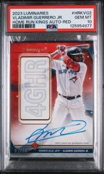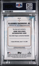The centerpiece of this card is the autograph of Vladimir Guerrero Jr., authenticated and professionally graded by the leading authority, PSA. The card is in impeccable condition, garnering a perfect Gem Mint 10 grade, the highest possible grading level achievable. This grade speaks volumes about the card's pristine condition, maintaining its original vibrancy and flawless features.