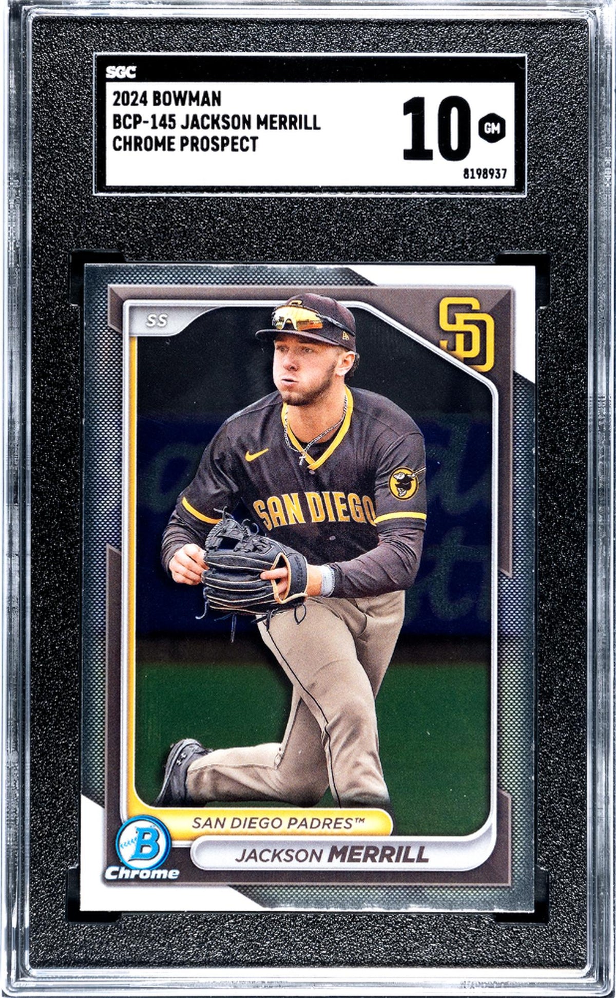 The card's key features are its Topps Bowman branding, its inclusion in the Chrome Prospect set, its perfect Gem Mint 10 grade from SGC, its association with the San Diego Padres, its status as a baseball card, and its 2024 release date. These features enhance the card's appeal and make it a must-have for any serious collector or baseball fan.