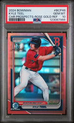 Dive into the love of baseball with this exceptional 2024 Bowman BCP48 Kyle Teel Rose Gold card. Manufactured by the renowned Topps, this card is a part of the Bowman brand, well-known for its premium quality and adherence to the highest standards.