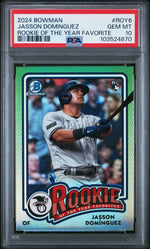Key features of this card include its Gem Mint 10 quality, its status as a 'Rookie of the Year Favorites' card, its PSA grading, its association with the New York Yankees, and of course, the depiction of the incomparable Jasson Dominguez. Don't miss this chance to own a piece of baseball history. Add this card to your collection today and cherish it for years to come!