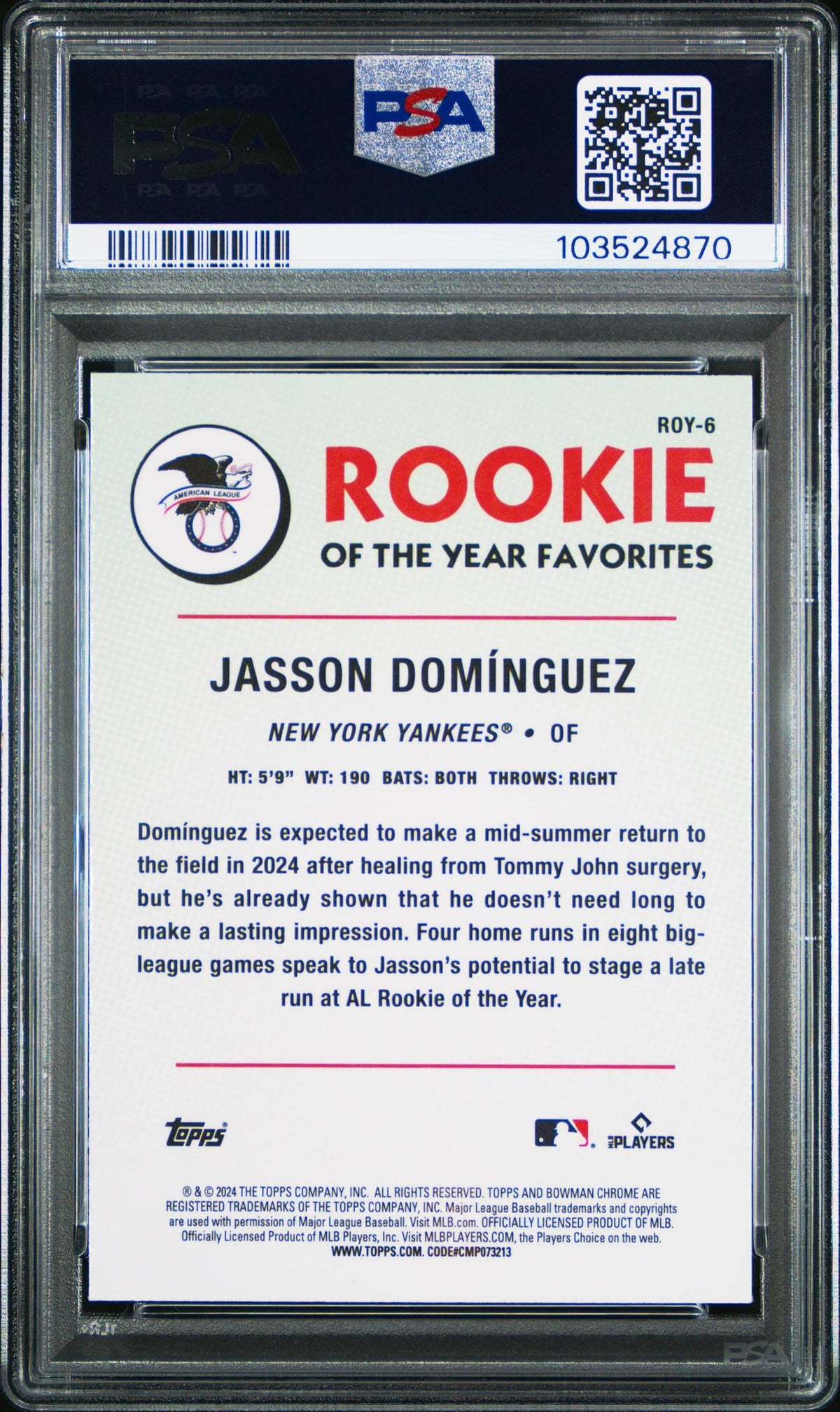 Whether you're a die-hard fan of Jasson Dominguez, a New York Yankees enthusiast, or a collector of high-grade sports cards, this 2024 Bowman ROY-6 Jasson Dominguez card is an absolute gem and a worthy addition to your collection.