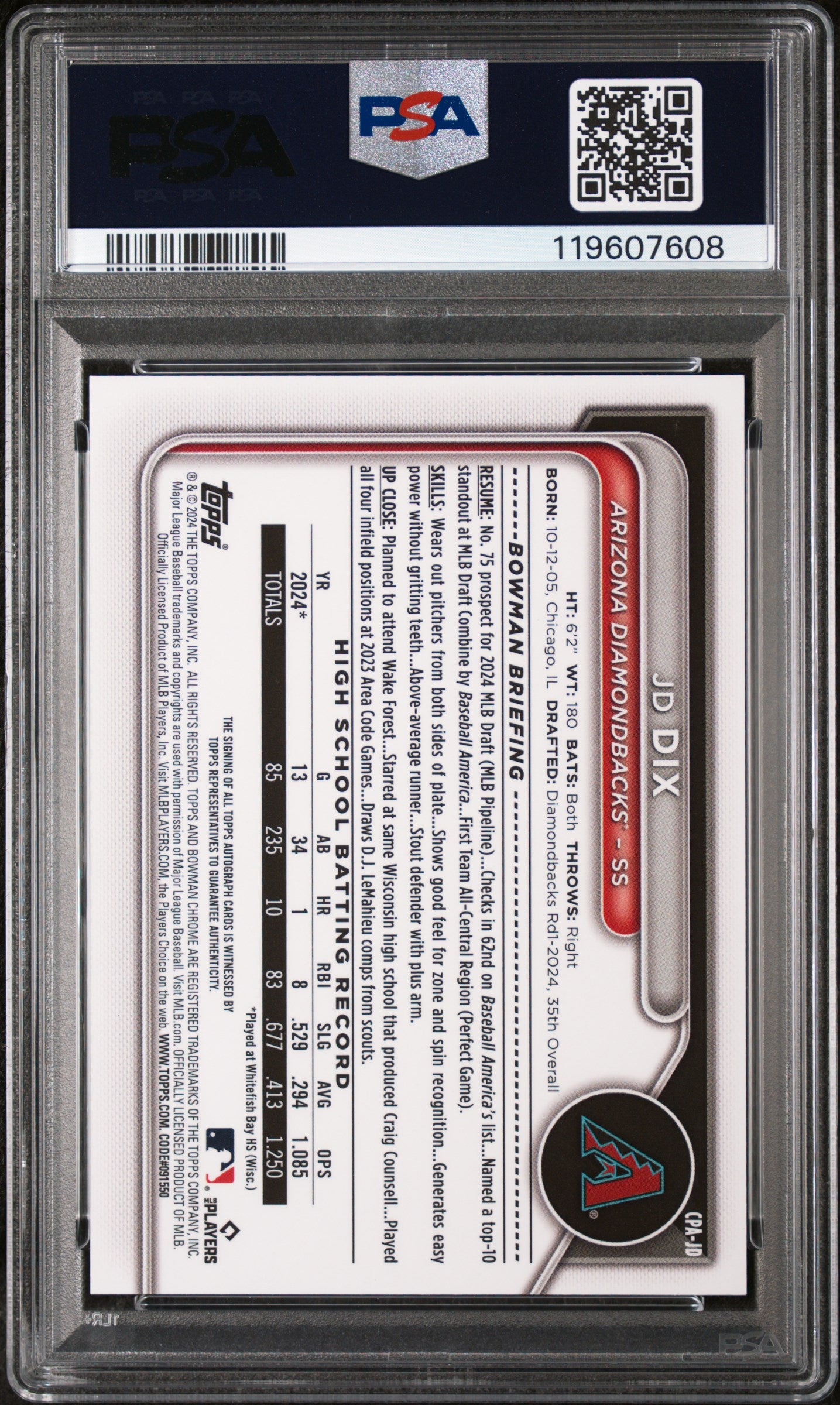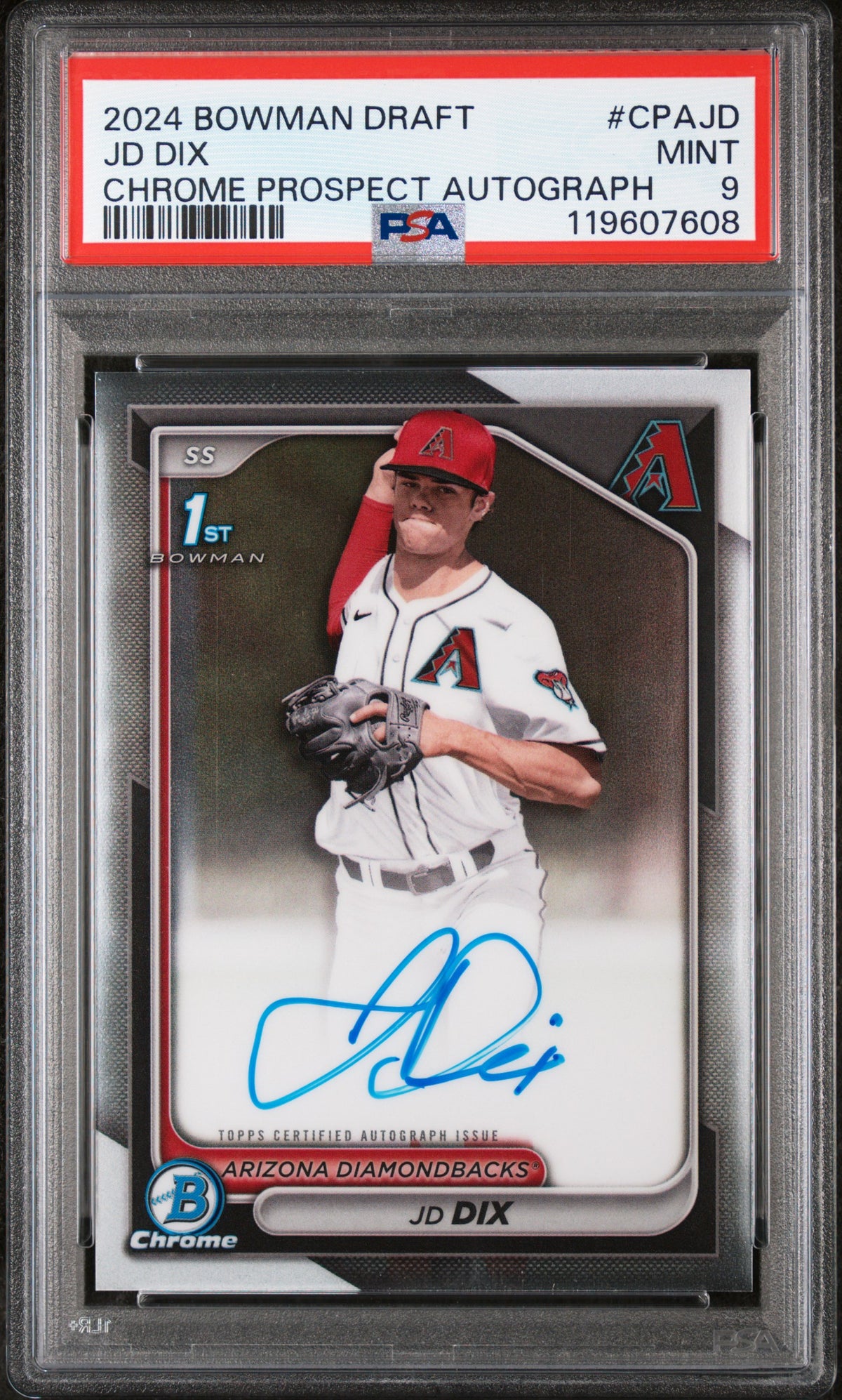 With a card number of CPA-JD, this gem is a must-have for any serious collector. It encapsulates the excitement and potential of JD Dix's career in its early stages, making it a valuable and meaningful addition to any collection. The card's key features include its 2024 Bowman Draft designation, the Chrome Prospect Autograph, and the PSA Mint 9 grading.