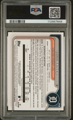 The key features of this card include its autograph, serial number, unique blue wave design, PSA 10 grading, representing the Detroit Tigers. This card perfectly encapsulates Bryce Rainer's potential and talent.