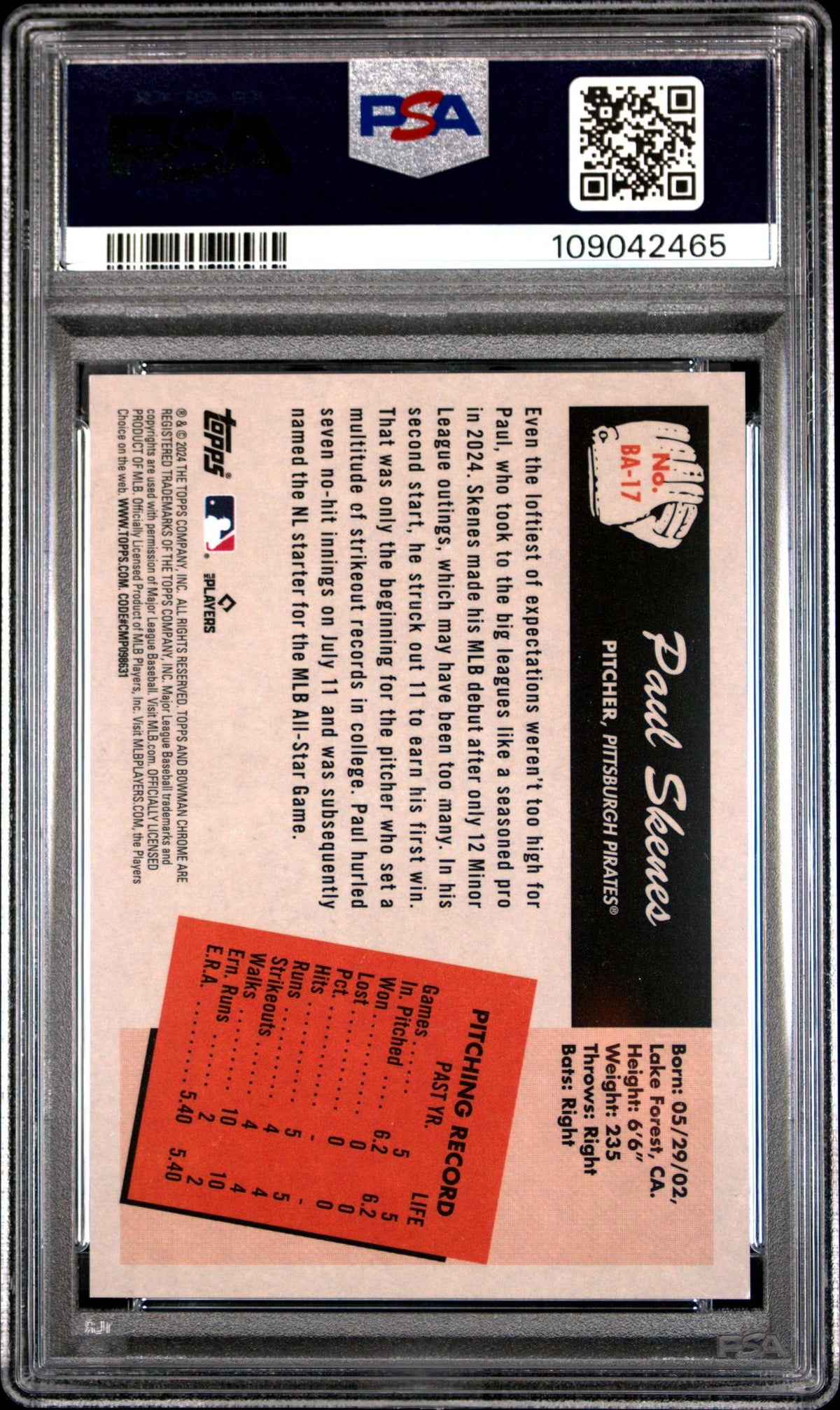 Step right up, sports enthusiasts and dedicated collectors! Feast your eyes on this truly impeccable, 2024 Bowman's Best BA-17 Paul Skenes rookie card. This gem, brought to you by the renowned manufacturer Topps, is part of the highly coveted 1955 Bowman Anime insert set - a must-have for any serious collector.