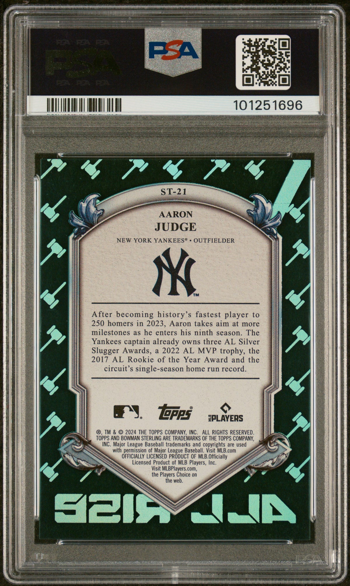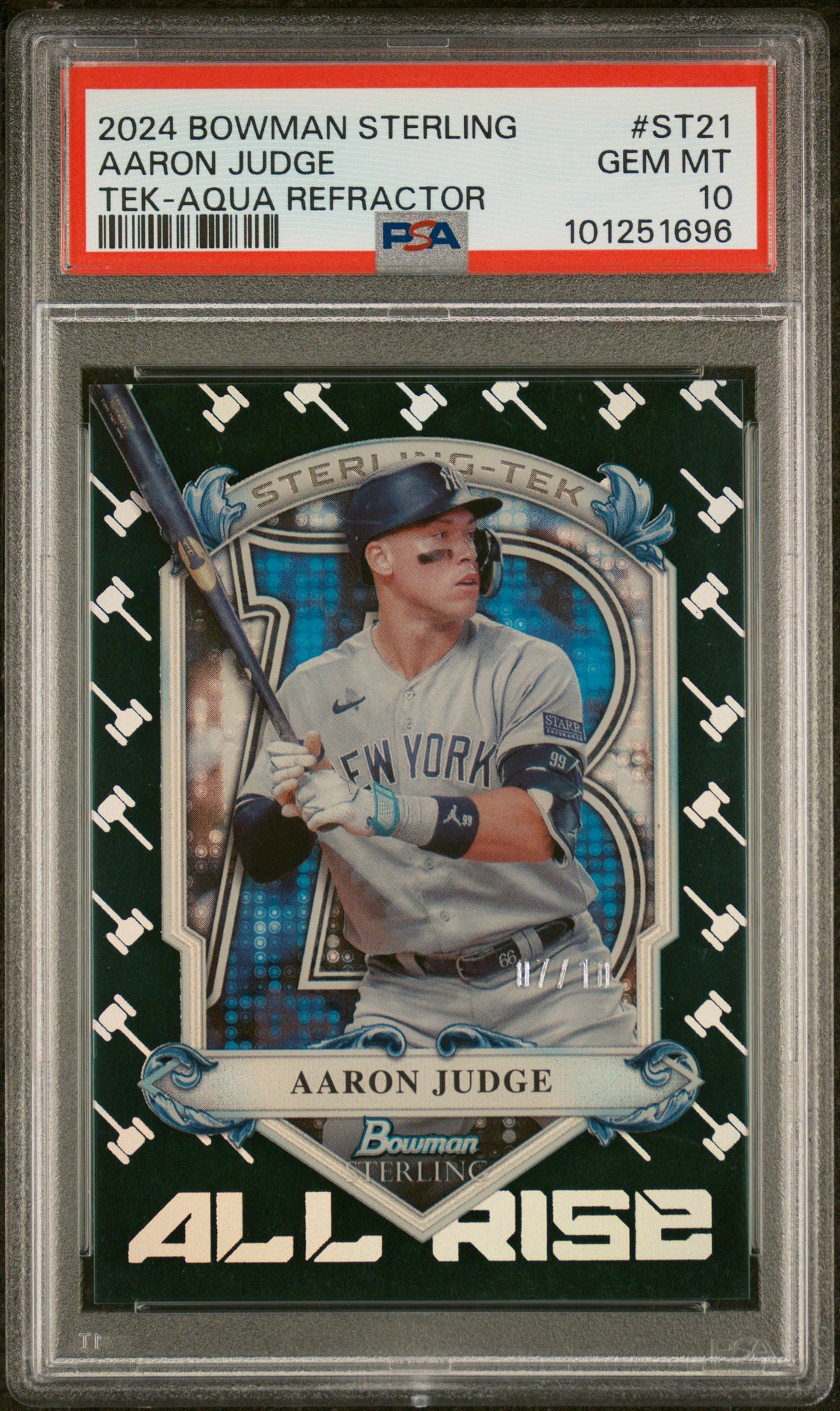 Immerse yourself in the world of baseball memorabilia with this exquisite 2024 Topps Bowman Sterling Aaron Judge card. This is no ordinary card, as it boasts a unique '1/1' serial number, indicating its unparalleled rarity. The card features Aaron Judge, a star player for the New York Yankees and a prominent figure in the MLB. Known for his power and precision, owning a card of his certainly elevates any collection. The card comes from the esteemed 'Bowman Sterling' set and is part of the 'Sterling-Tek' insert set, further enhancing its desirability among collectors. What sets this card apart is its Tek-Aqua Refractor parallel - a captivating feature that adds a touch of sophistication and uniqueness. This isn't a rookie card, which means it's a reflection of Judge's established career and success in the league, adding an extra layer of value and significance. Moreover, this card is not autographed, allowing the focus to remain solely on Judge and his commanding presence on the card. While it doesn't include any memorabilia, its worth lies in its own standalone merit. One of the most impressive aspects of this card is its professional grading. Evaluated by PSA, the leading authority in card grading, it has received a perfect 'Gem Mint 10' grade. This is the highest achievable grade, indicating the card is in impeccable condition and has been preserved flawlessly. In summary, this 2024 Bowman Sterling ST21 Aaron Judge card is a spectacular piece of baseball card artistry. Its unique features, coupled with its flawless condition and grading, make it a must-have for any serious collector or baseball enthusiast. Secure this unparalleled piece of sports history before it's gone!