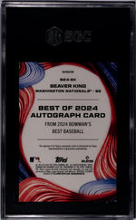 Key features include its 2024 Bowman's Best attribute, Seaver King's autograph, refractor finish, Mint+ 9.5 grading by SGC, and its connection to the Washington Nationals in the MLB.