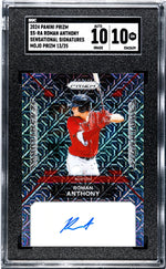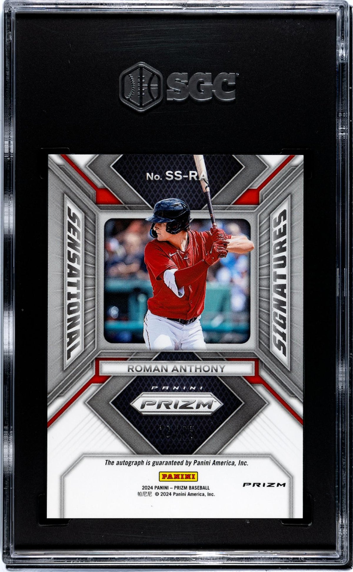 In summary, this 2024 Prizm SS-RA Roman Anthony Mojo card is more than just a piece of memorabilia; it's a piece of sports history. Its limited edition status, autograph, unique design, and perfect grade make it a truly sensational find for any collector. Its key features are its limited edition status, Mojo Prizm design, autograph, SGC graded Gem Mint 10, numbered 13/25, and its inclusion in the Boston team and Sensational Signatures insert. Add this extraordinary piece to your collection and own a piece of Roman Anthony's legacy.
